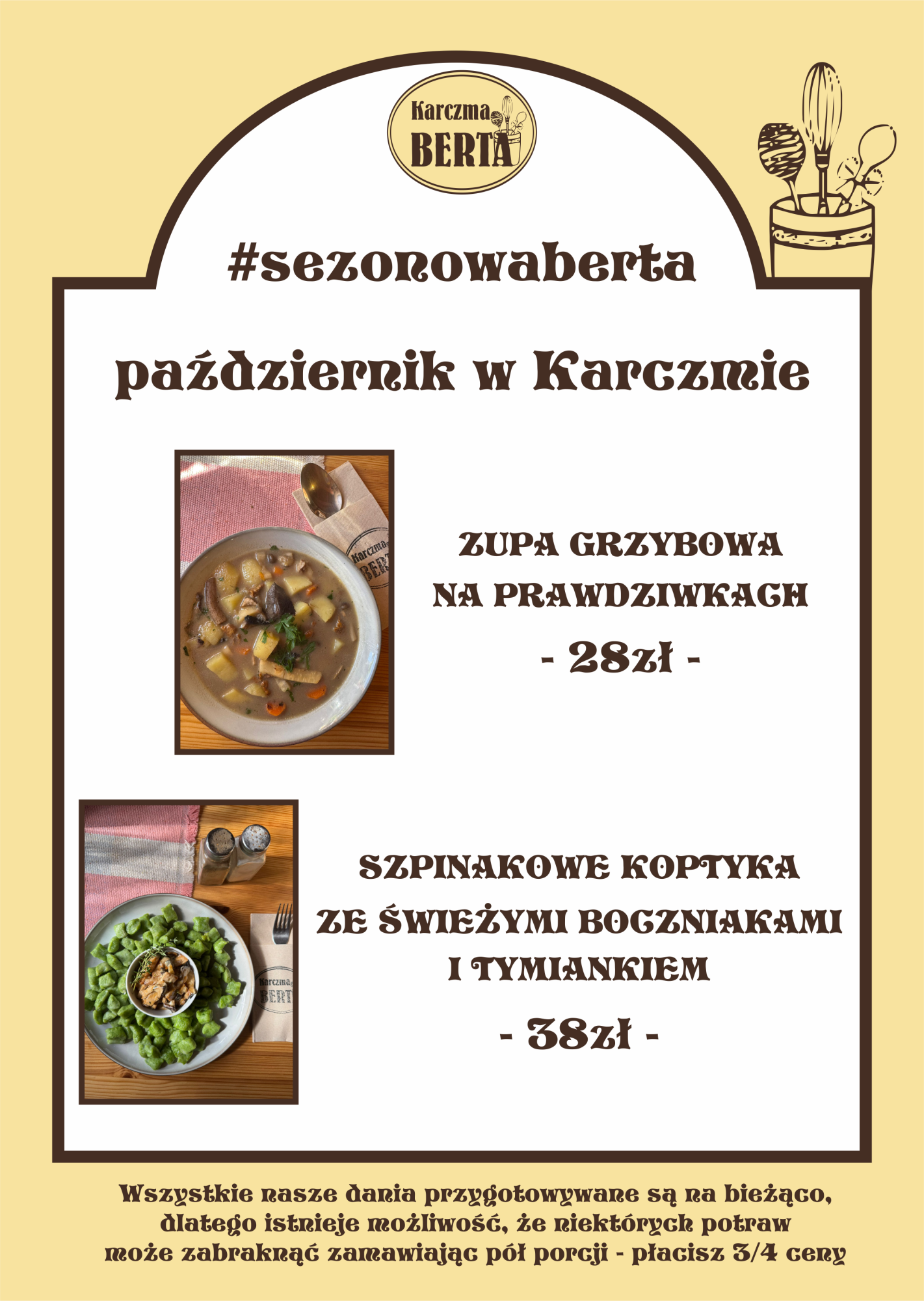 - Przed nami październik, a wraz z nim nowe dania w karcie! A jak październik, to i grzyby, więc zapraszamy na zupę grzybową na prawdziwkach oraz na kopytka szpinakowe ze świeżymi boczniakami i tymiankiem - zachęcają Karolina i Wojciech Kaczorowscy, właściciele Karczmy Berta.